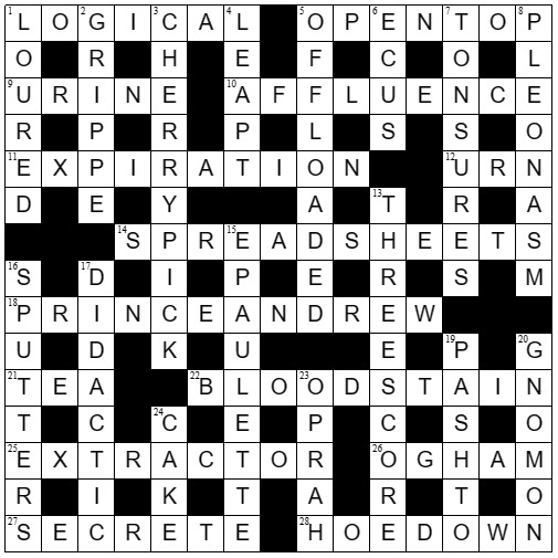 So many clues to love, with big ticks to SPREADSHEET, EXPIRATION, PRINCE ANDREW, SECRETE, DIDACTIC.