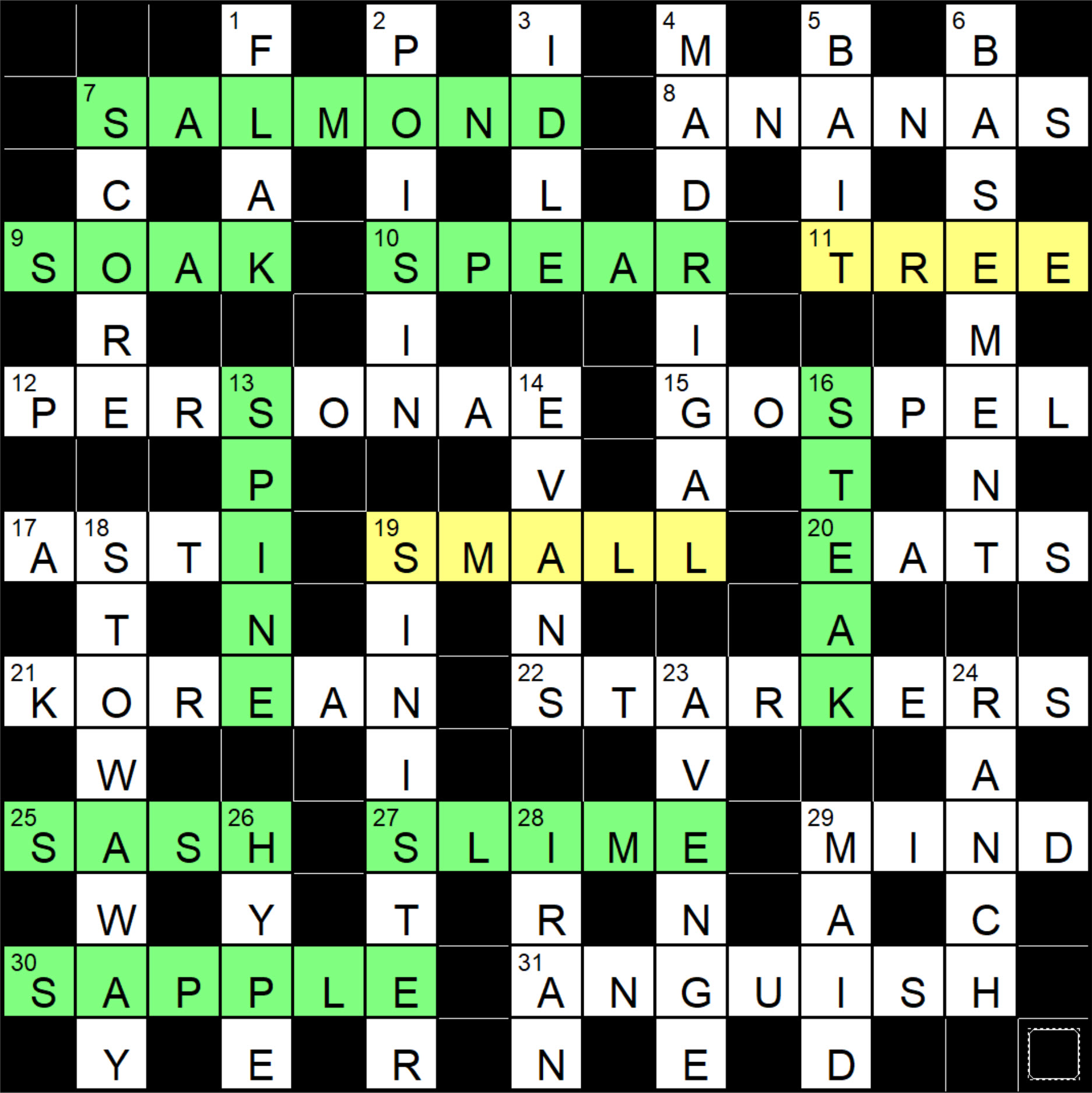 Thanks Eccles for a nicely crafted themed crossword. My top picks were ASTI, KOREAN, MIND, and AVENGE. I revealed SALMOND (nho), PERSONAE, and EVANS; I couldn’t parse POISON as I don’t know (or care about) teletubbies. (I wonder if it’s worth my while to learn their names for solving purposes; cricket terms, Spice Girls, and Harry Potter seem to fit in that same category for me.) Thanks duncanshiell
