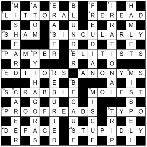 A wonderful puzzle by one of my favourite setters with some encouraging write-ins for starters and some knotty problems before completion. Loved the theme, the typically ingenious misdirections in the clues, and the cleverness of SCRABBLE, SINGULARLY and LITTORAL.