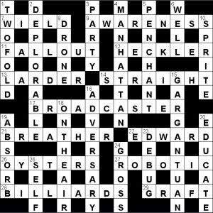 I found this harder than many recent Eye puzzles. I had to read all the way down to below the half way mark before I hit a clue I could cold solve quickly. Once I had got 22 (that reference to Ed Sheeran was very obvious) the smaller answers in that bottom right hand corner all got filled in quickly. However I could not brek out of it. Both 28a and 15d, despite three of its crossing letters, proved elusive. In fact later I found it was because of the crossing letters – one of them – that 15d would not solve. In my haste I had whacked in GRIFT instead of GRAFT.