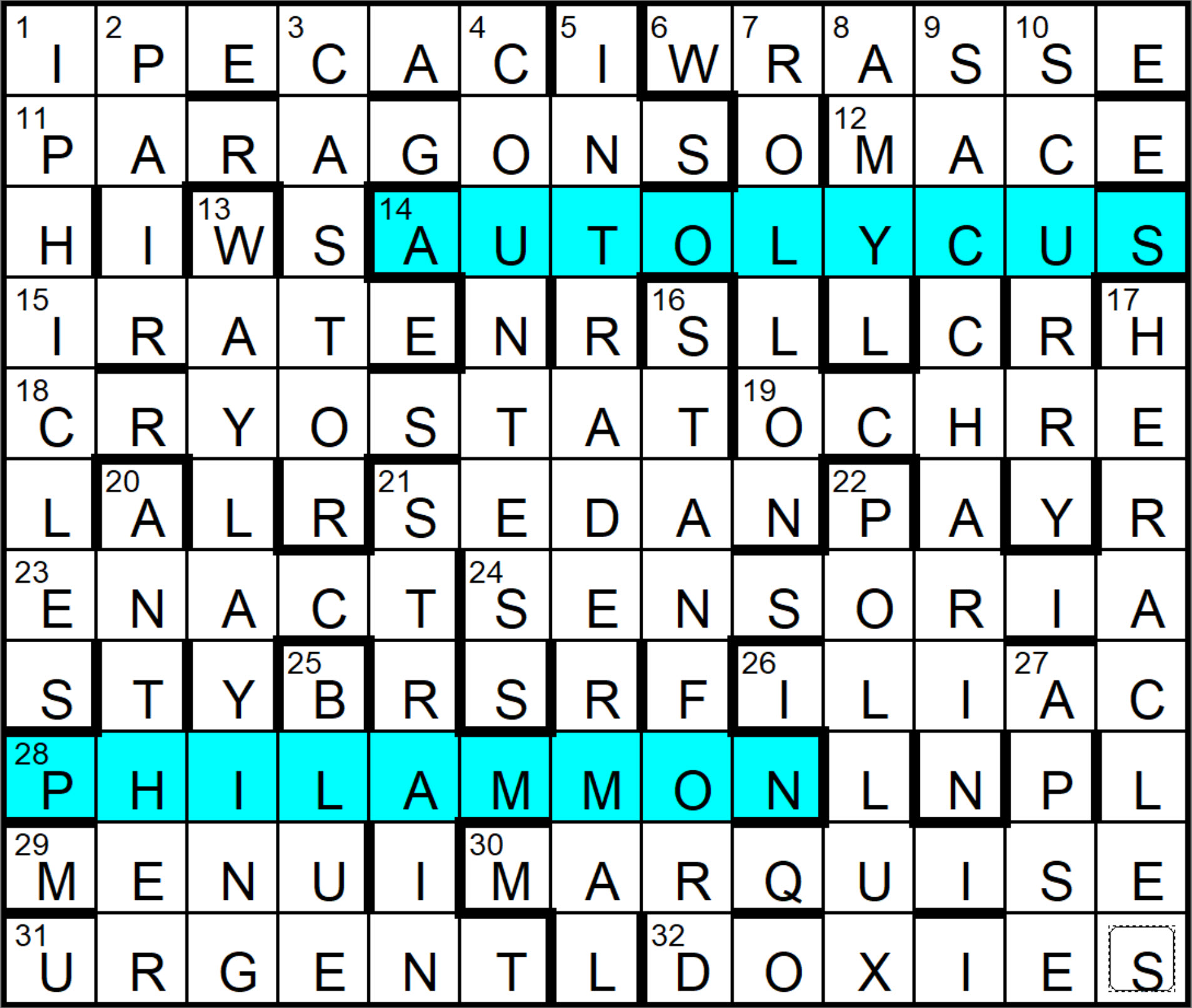Finally, the internet is not entirely clear about the parentage for the final pair, but for the purposes of this crossword we will go with CHIONE as the mother of AUTOLYCUS and PHILAMMON by APOLLO and HERMES, respectively.   As this fits perfectly with the ‘message’ from the Down extra words, I have highlighted AUTOLYCUS and PHILAMMON in the grid below.