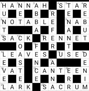 I think we have been progressing steadily in terms of difficulty every week so this was the right kind of challenging for me. Like some others have mentioned, I was thrown off by ‘wine’ and was wondering if somehow a flute or snifter was being charaded. Also agree with Shanne over the quibble around the clueing of LEVEL. Was unable to get HUNTS and parse VAT but that’s from my lack of knowledge of English counties or museum abbreviations. Struggled a bit also to get NOTABLE, it was a nice clue! Thanks for the blog!!