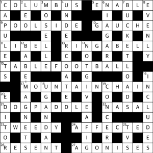 I quite liked this puzzle. My only quibble was the historical inaccuracy of 1a COLUMBUS, but it didn’t impede the solution. Having worked for a university, I fully accept the academic connotation of 23a TWEEDY.