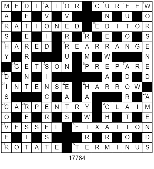 This took some getting into, with several answers tentatively pencilled in, although most proved correct. We liked TERMINUS and FIXATION.