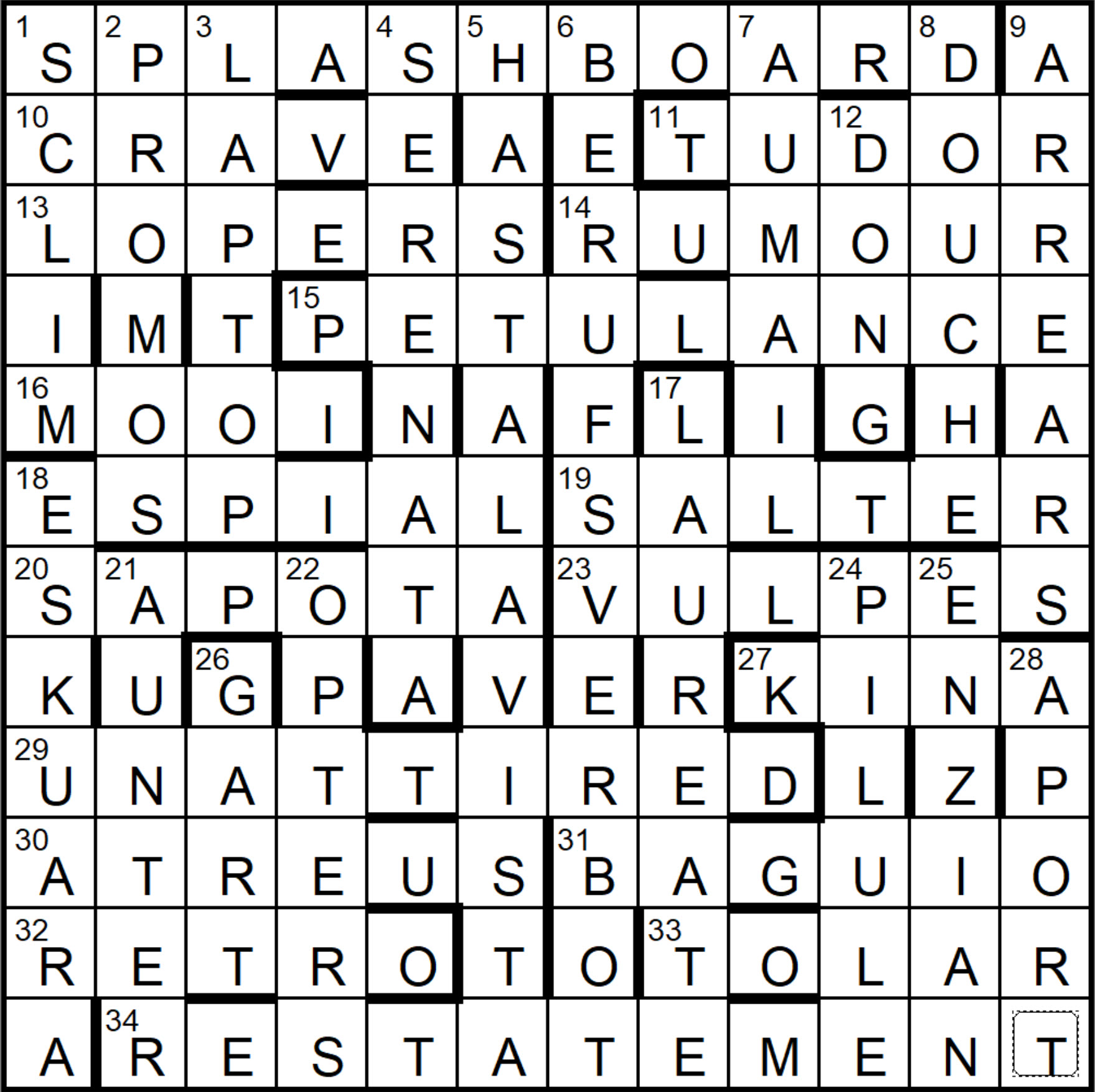 I got off to a reasonable start with this puzzle with a few of the early downs which led to me to SPLASH something at 1 across. VULPES at 23 led me to think that VERB would be the part of speech in 6 down.
