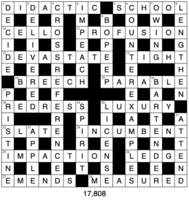 I did not think of number one to mean PEE* and did not know “killed by the mob” is ICED until I looked it up. A long list of clues with ticks includes EMENDS, DEVESTATE, PARABLE, SILENCE, DELIVERED and I could go on.