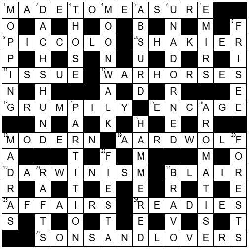 Another 19a AARDWOLF failure here. I couldn’t get past OFF for leaving, and trying to move an R to the left somewhere, but it was an excellent clue. I also couldn’t parse 9a PICCOLO – I ignored the punctuation, contrary to PB’s advice @2.