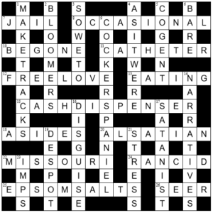 13. Thanks Slormgorm for a solid set of clues. Except for my failure with RANCID, this was smooth sailing with JAIL, MISSOURI, AS IT WERE, COCKER SPANIEL, DESPOT, and STRESS being my top picks. My only objection was the definition in 15a being ‘hole in the wall’ — seems weak to me. Thanks Cineraria for the blog.