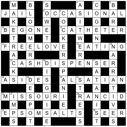 18. I found this puzzle relatively easy but very enjoyable. I too liked the Missouri clue. A much more leisurely stroll than I had with Paul’s puzzle.