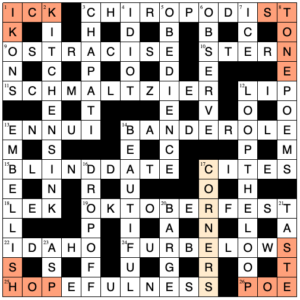 Faves include CHIROPODIST, LIP, BLIND DATE (COTD), OKTOBERFEST (podium), KITCHEN SINK, IDIOT, LOOP-THE-LOOP (podium), CORNERS and DROP OFF (commendation – but I rarely give awards to clues with cross-references to other clue numbers. It’s very rare for the number not to detract slightly from the surface)