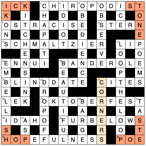 Thanks Bluebird for a creative crossword. Even though I failed to see the full significance of the corners I enjoyed this with my top picks being BLIND DATE, POE, KITCHEN SINK, TONE POEMS, and LOOP-THE-LOOP. I needed a word finder for the nho BANDEROLE and FURBELOWS. Thanks B&J for the blog.