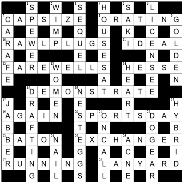 A few ‘off the wall’ constructions on display but nevertheless an enjoyable solve. Tops for me were CAPSIZE, RAWLPLUGS & SEQUEL.