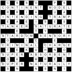 I did notice the SUPER theme about halfway through, plus the nicely placed CRIMINAL CHARGE. Had to laugh at the ONANIST/TANKER link as well. I didn’t get the significance of TRAMP, so what a great clue. Brilliant prize puzzle.