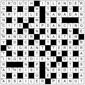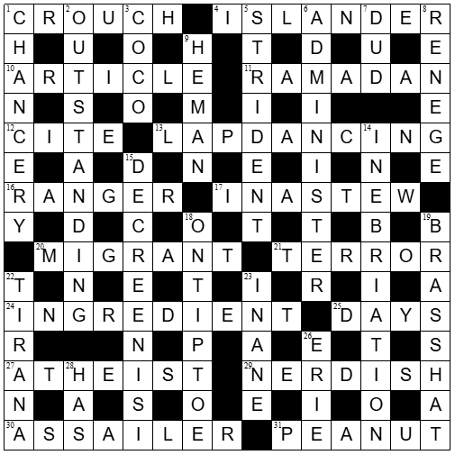 Thanks Moo for an excellent set of clues, all with easy-to-read surfaces. My top picks were CROUCH (LOI), ARTICLE, LAP DANCING, DUD, INEBRIATION, ON TIPTOE, BRASS HAT, and INANE. Thanks Teacow for the blog.