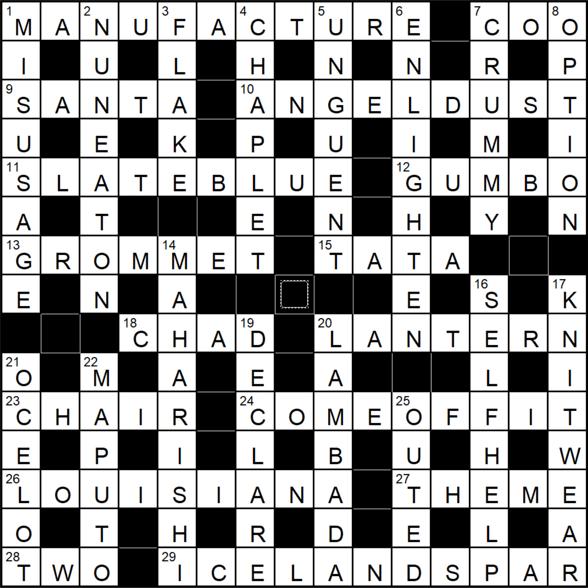 So much to like in this smoothly crafted puzzle. As always. And I learned what an UMBO might be! As well as another meaning for TOPICAL. Really, there are too many favourites to list – I guess my biggest ticks/smiles are linked to MANUFACTURE, SLATE BLUE, LANTERN, ICELAND SPAR, MAHARISHI and OCELOT.