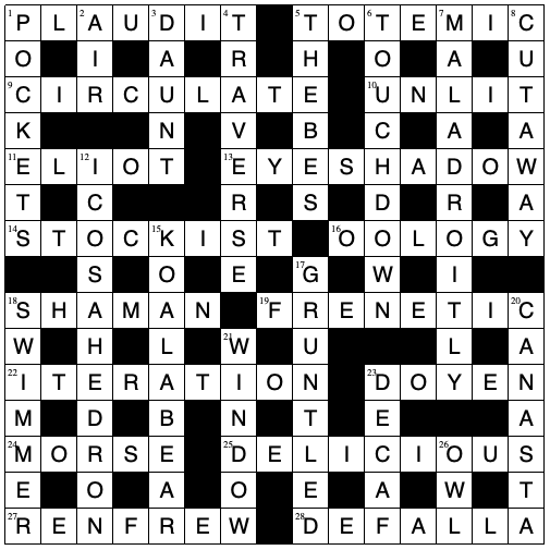 PLAUDIT, ELIOT, OOLOGY (which should please another setter), DOYEN, DELICIOUS, TOUCHDOWN, MALADROITLY and GRUNTLED were my faves today. Not sure about defining SHAMAN with a phrase including MAN but that is the most minor of quibbles.