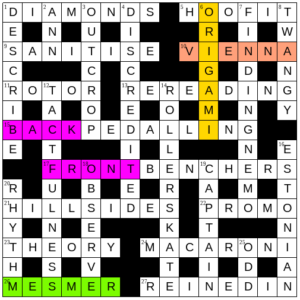BACK PEDALLING – Didn’t have a clue until I solved FRONT BENCHERS, which had a more obvious anagrind, then came back to it and realised that the first word might be BACK, and that “high” might be an anagrind. A good example of a regular Everymanism helping me out.