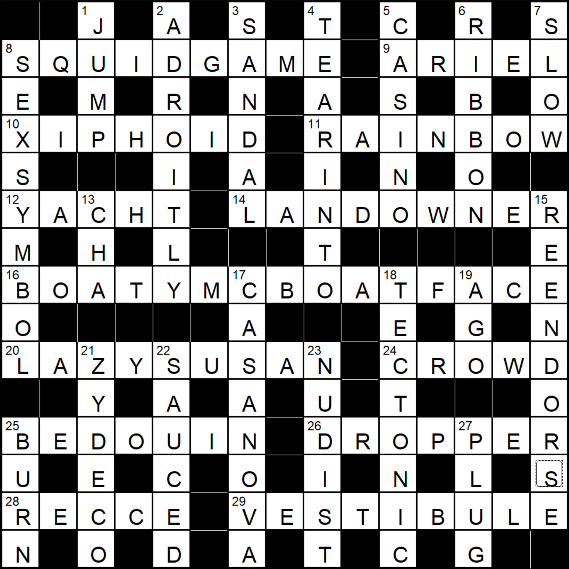 I shall await enlightenment from other posters wrt any theme; surely something is behind some strange selections – XIPHOID for one, though that could just be a result of SEX SYMBOL which is not that outre, I suppose. But SQUID GAME as well? I’ve never heard of the program and that answer had to be revealed. ZYDECO I have encountered – but it is another oddity. It cannot all be driven by Phi’s decision to place BOATY etc across the middle, can it? As duncan observes, a pangram might have been the justification but it’s not complete. I’ve even checked the results of the annual burger competition – which was quite recent – but it doesn’t appear to be any of the finalists.