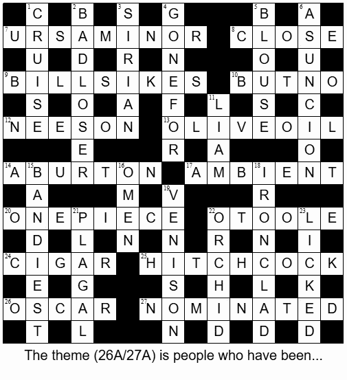 Most of the clues cross-referenced to 26A/27A mention ‘actors’ (and one ‘film great’), and I soon had Glenn CLOSE from 8A/10A/24A; Richard BURTON from 4D/14A; and Tom CRUISE from 1D. And some of the Down crossers for 26A/27A started to create the skeleton of ‘OSCAR’ and ‘NOMINATED’.