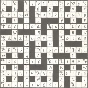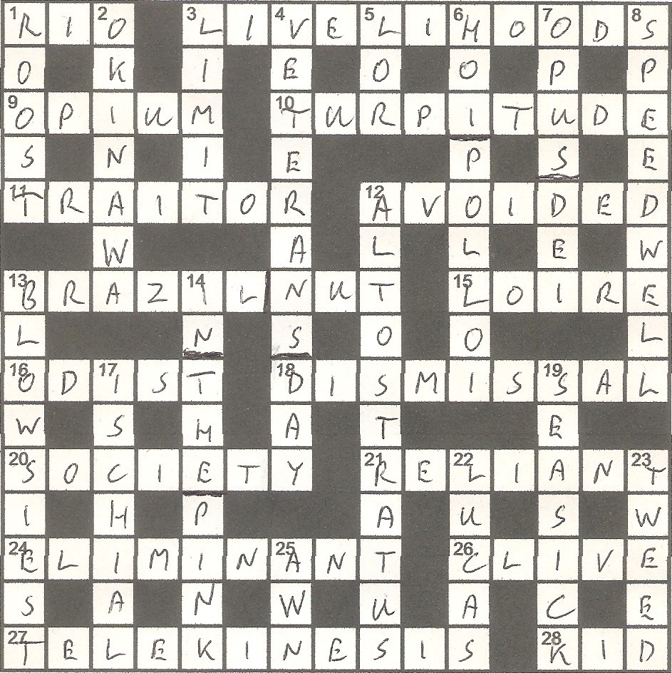 I’m with Hovis on the parsing of BRAZIL NUT – Z inside an anagram. I did actually find this more approachable than Monk can sometimes be, not falling into the pitfalls that distracted our blogger. However, even with all the crossers, I managed to fail to find the correct anagram fodder for ALTOSTRATUS. I’m not sure I’d agree that the ellipsis is doing heavy work in the clue for ELIMINANT; the device is often used when there is a link between surfaces but this appears to be be of the (reasonably rare) occasions when it is being used properly at the cryptic level and referring to the previous solution. Neatly done – and so much nicer than a cross reference. I liked the definitions for TELEKINESIS and LIVELIHOODS.