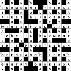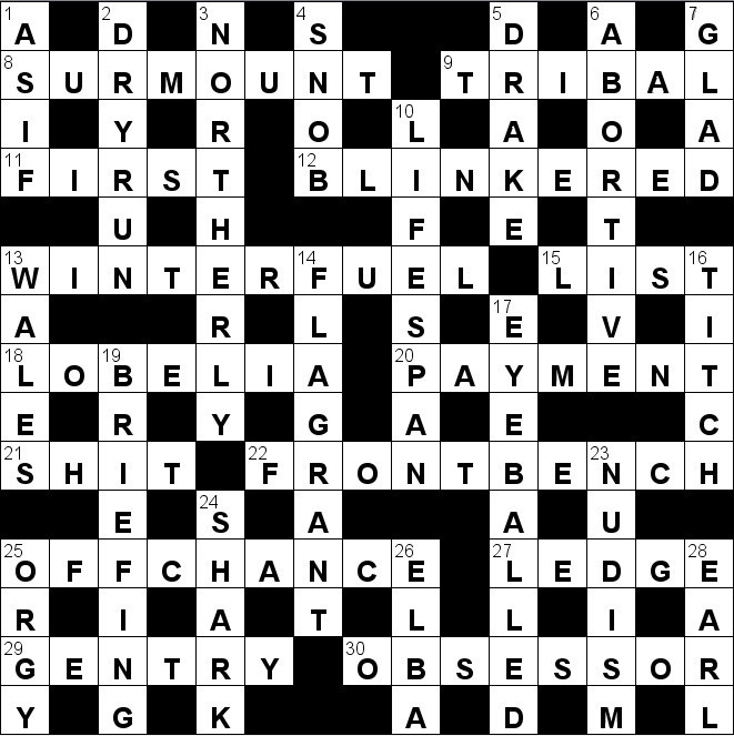 Got stuck a few times – I’d pencilled in ODD CHANCE and HEATH-ERLY (wind across the heather??) which I only managed to dislodge by resorting to a crossword solver to get BRIEFING and SURMOUNT. Had to do same for TRIBAL though that was just a blind spot before GLAD as my LOI.