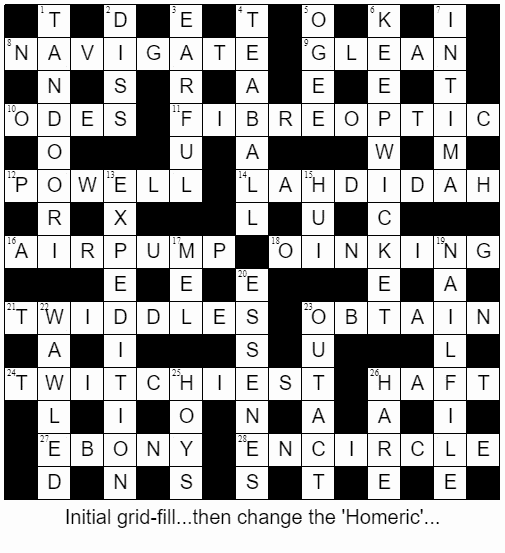 Much of the preamble made little sense until I had got enough of the extra letters to make the message readable. The other message (from the numbered cells) was a very neatly engineered surprise, and the ‘Homeric’ conclusion was hilarious. Altogether, a very good Genius puzzle with many excellent clues. It was a clever idea to avoid the ‘nina’ that would otherwise have formed itself across the top (THETAKI) by putting two ‘wrong’ letters there (TDETOKI).