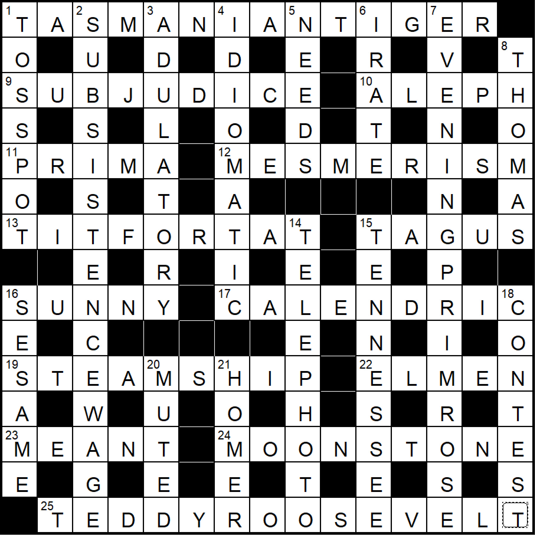 Phi often gives us a theme. There may be some entries associated with TEDDY ROOSEVELT, but the links are quite tenuous. The strongest link I could find was between ROOSEVELT and the concept of a SUBSISTENCE WAGE. There are STEAMSHIPs (and submarines) named after ROOSEVELT. He wasn’t a significant tippler and he didn’t represent TENNESSEE at any time. He was a hunter, but there is no reference to him ever hunting a TASMANIAN TIGER.