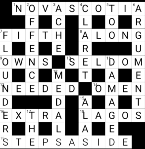I’d add, re Shanne’s comment on 10ac, that on rare occasions–like maybe one time in fifty–the ellipsis linking two clues might mean that you do have to consider the two clues or their answers together to solve them. It’s rare, and it’s a device you’ll never see in an easy crossword like these, but–just be on the lookout for that.