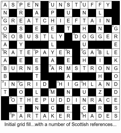 RABBI(E) BURNS, the HIGHLAND FLING, the Isles of MUCK and UNST(uffy) and the festival of UP-HELLY-AA all point north of the border (from where I’m sat, as least), and with UP-HELLY-AA occurring on 28 January 2025, along with incantations of Burns’ homage to the Haggis – GREAT CHIEFTAIN O’THE PUDDIN-RACE! – on his name night, on 25th January, maybe this one could have been held back for 8 weeks or so?