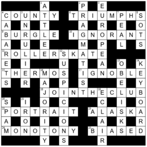 TT = dry is new to me. Or, perhaps as likely, I’ve seen it before but it’s not stayed with me. Not knowing that, nor one or two other elements in other clues, may have slowed me down a bit but were in the end no obstacle to completion of an enjoyable puzzle.