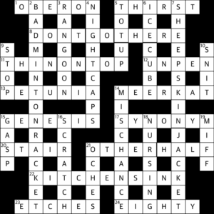 This was an excellent Everyman. 15a GENESIS was one of his best primarily clues, 17a SYNONYM was superbly succinct, and 14d MISCHANCE was a clever one-word anagram.