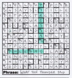 Fortunately, we were given numbers to help us put those in order, and, sure enough, 1,2,3,4,5 spelled THE BURIAL OF THE DEAD. Home and dry! (Well, not quite – we still had to progress via that GAME OF CHESS to the DEATH BY WATER and who was it who died? PHLEBAS the Phoenician – what a gruesome and gloomy section of the poem!) Chaliceas’s notes in her Faber paperback told us that ‘What Tiresias sees, in fact, is the substance of the poem’ and there were PHLEBAS and TIRESIAS. How beautifully the entire crossword recalled the poem!