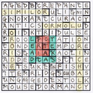 We highlighted all those suspicious Os: ORillion, wORst, thORough, doOR, tORose, fORces,ORation, loOR, minOR, ORate, shORed, nORthermost, cORe, sORrowing, poORer and cORded and, as we solved, MERCHANT THREE TWO emerged, confirming our suspicions that the Merchant of Venice was our theme. (There aren’t that many well-known dramas which revolve around a counterfeit in a container…) That explained why all that gold was appearing in the clashes, CAUCUS clashing with LIGNIN, CICUTA clashing with SAUBAS, SAUGER clashing with TIN FISH, and UNGAUGED clashing with MAGS. Gold was clearly not the casket to choose, with Au giving way to its alloy components Ni, Ag, Cu and Tin, neatly leaving real words in both directions.