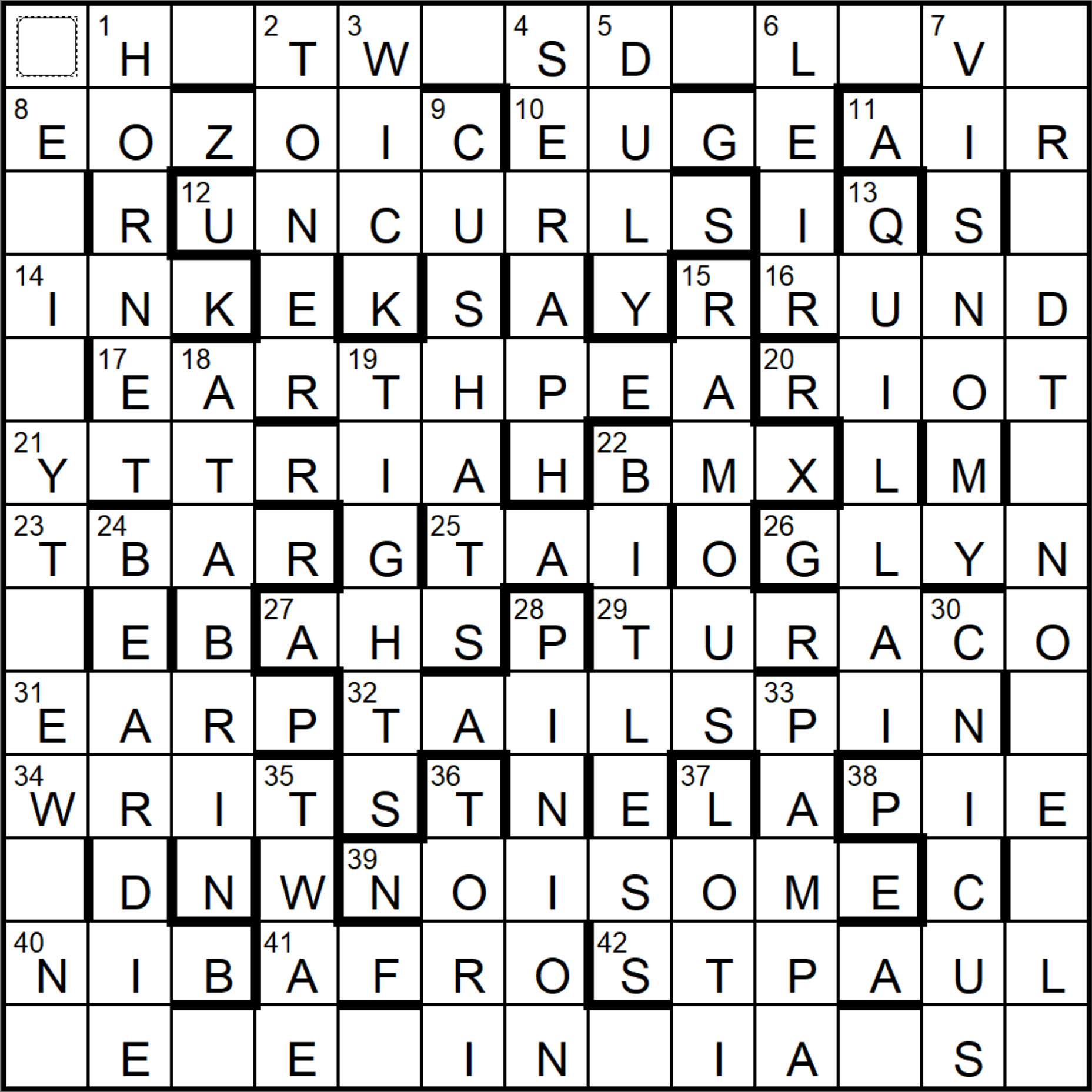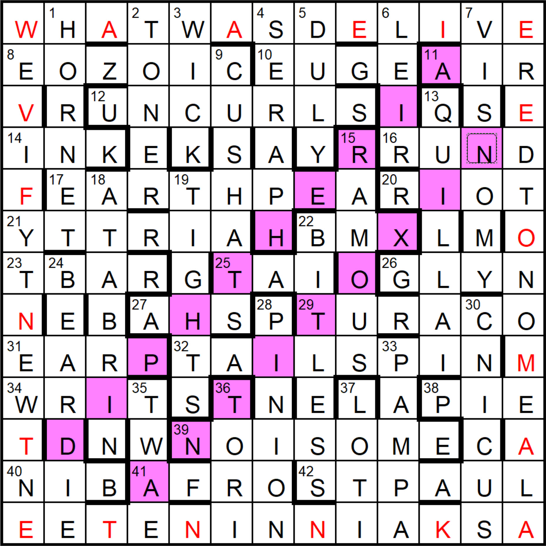 The preamble was quite short and told us that the names of four individuals contributing to a team effort are concealed within the clues and must be removed before solving (disregarding some punctuation). Starting in the top left cell, a clockwise-running perimetrical question identifies 19 cells in two straight lines which solvers must highlight. Unchecked letters in the perimeter might give IN AN EVENT AWAKE TO FAME.