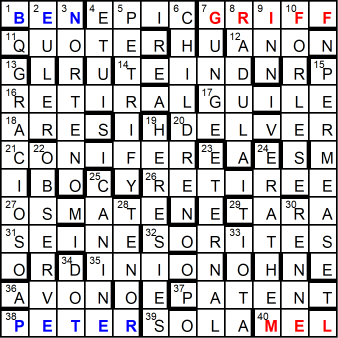 Ifor @2, no, it completely went over my head that each I is central. That is very neat indeed, and very impressive. I did notice the PETE(r) peculiarity, but my only real issue was that it introduced an asymmetry to the blog, with my commentary not quite matching the highlighted grid entries. So very much a blogger problem rather than a solver problem!