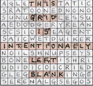 GAG, ALTERNATE, COLUMN CENTRAL and PRIDE appeared as those five extra words and we soon saw a rather surprising message emerging with the corrected misprints: VACATE ALL BUT THIRTY-TWO CELLS. Now there was plenty of head-scratching. To one of the Dash team (the Numpty) this seemed rather like a GWIT. Were we to ‘alternate the central column’ and how did GAG and PRIDE give us the letters of a word that needed replacing? Vagans by sheer good luck went for alternate letters in the central column, and then seeing THIS in the top row kept on reading downwards and saw the rest without too much headscratching, but agreed that it was more intuition than deduction. Discussion point dear fellow-solvers: does that matter? And where does the boundary line lie between a juicy PDM and a frustrating GWIT. (One related rule of thumb many of us use for the Listener is that if it doesn’t feel completely right, it probably isn’t right.) Anyway: here’s the Numpty’s grid: