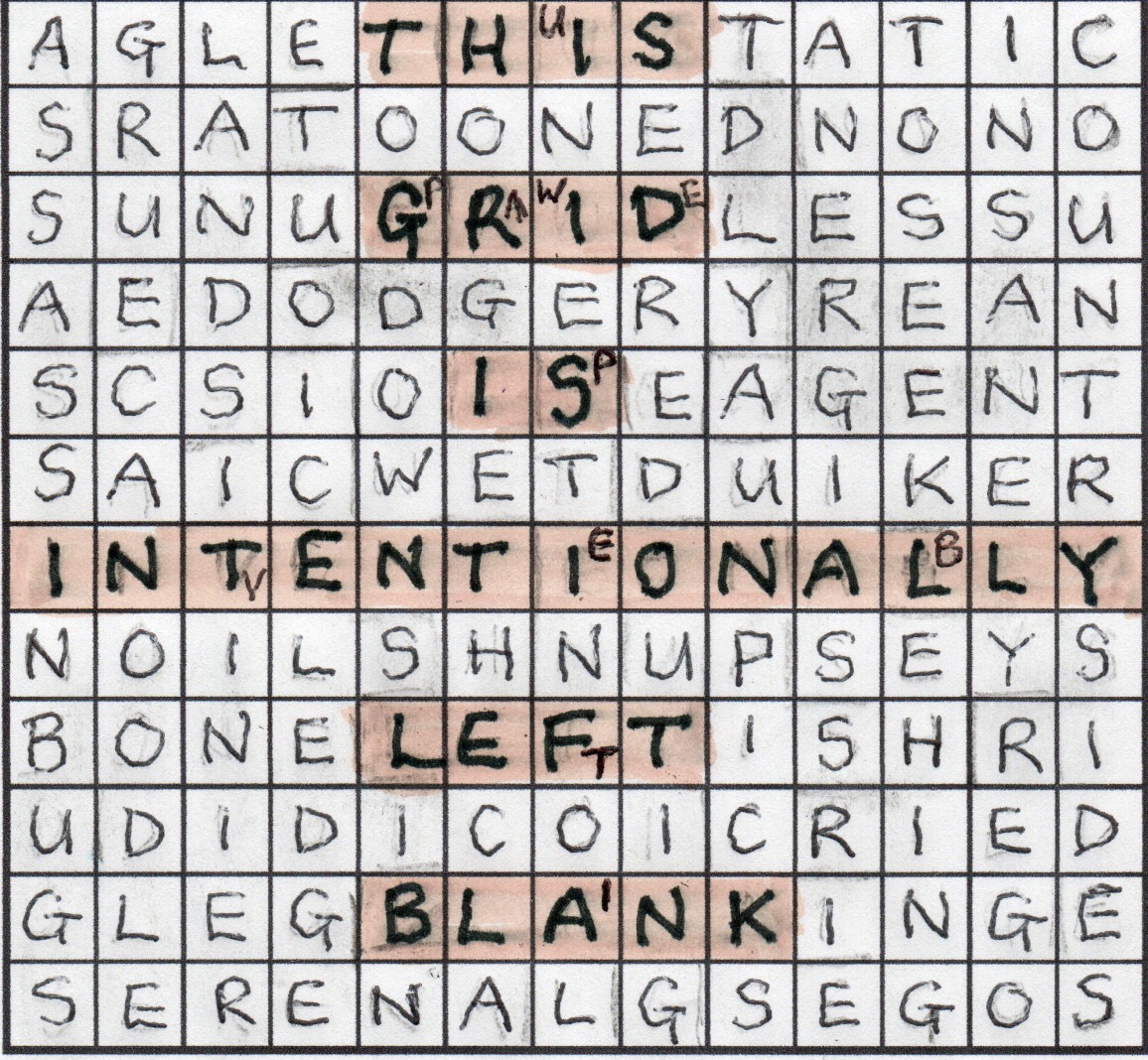 GAG, ALTERNATE, COLUMN CENTRAL and PRIDE appeared as those five extra words and we soon saw a rather surprising message emerging with the corrected misprints: VACATE ALL BUT THIRTY-TWO CELLS. Now there was plenty of head-scratching. To one of the Dash team (the Numpty) this seemed rather like a GWIT. Were we to ‘alternate the central column’ and how did GAG and PRIDE give us the letters of a word that needed replacing? Vagans by sheer good luck went for alternate letters in the central column, and then seeing THIS in the top row kept on reading downwards and saw the rest without too much headscratching, but agreed that it was more intuition than deduction. Discussion point dear fellow-solvers: does that matter? And where does the boundary line lie between a juicy PDM and a frustrating GWIT. (One related rule of thumb many of us use for the Listener is that if it doesn’t feel completely right, it probably isn’t right.) Anyway: here’s the Numpty’s grid: