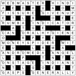 Couldn’t parse RUG (had to reveal it), and looking at the explanation here, my head’s spinning. Today’s was mostly enjoyable, but a few groans too. Never heard of MONEY SPIDER nor GERMANDER.