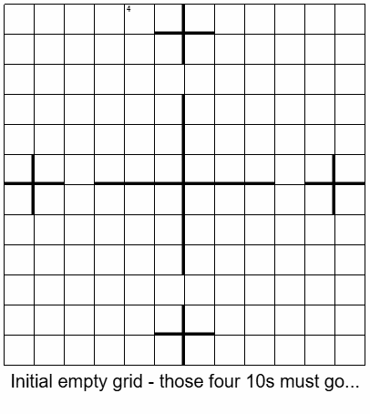 The answer to the second step was ‘yes, but, no, but‘! There are four 10s, and four 4s, which might be a logical place to start, rather than the eight 5s or twenty-eight 6s. But there are no slots of 10 or 4 in the grid?!
