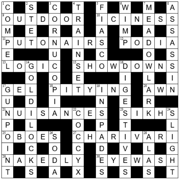 Thanks Bluejacket for a great debut. I recognised the setter’s name from elsewhere but this was my first attempt at a Bluejacket crossword. I found it to be ‘medium’ difficulty & revealed GUNPOINT; I also failed to parse AWN. All else eventually came to light with my top picks being OUTDOOR, ICINESS, LOGIC, SIKHS, GOLDILOCKS, and COCCYX. Thanks Pierre for the blog.