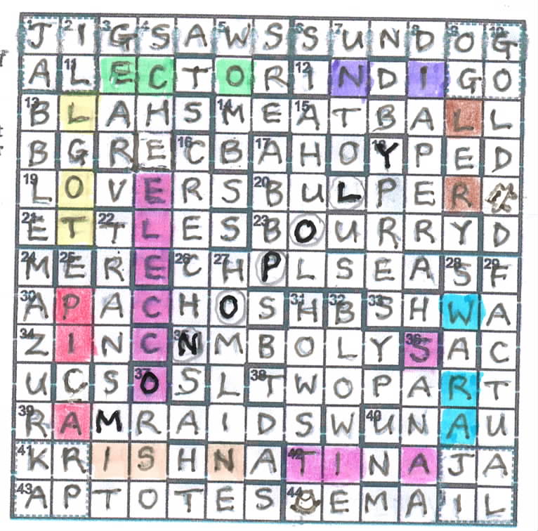 We’ve spotted that BUMPER CAR and GOLD CARD share an extra CAR, and that HATE MAIL and HOWS THAT share a HAT. One of the Dash team had recognised the theme by now (with the help of the title) but the ex-Numpty didn’t play this ‘board game’ with a car or a hat and was still mystified. It needed those five extra words (LEVIES, OSCARS, PLAIN, OPIATE and NOCTURNAL and the relevant manipulation of BUMPER, BLURRY, CHELSEA, APACHES, and EMBOLY to reveal MONOPOLY in the rising diagonal. Penny drops but what happens next? What a lot of material Deuce has managed to incorporate with his fine and relatively gentle clues.