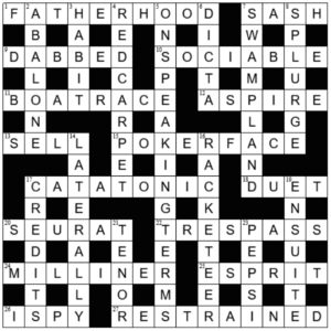 Aces again, Jack — fantastic grid! Feel like I’m echoing many with favoriting ESPRIT (“medium strength”) and SEURAT; also fond of MILLINER and FATHERHOOD.