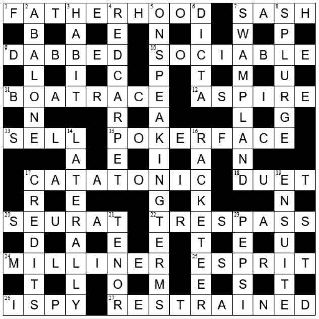 I did not parse the ESP element of ESPRIT so thanks to blogger for explaining that. Otherwise, all went in smoothly and I agree many of the surfaces shine. SOCIABLE, POKER FACE, SEURAT, DUET, HABIT and LATERALLY my favourites. Nice to have a relatively straightforward solve after my abject failure yesterday!