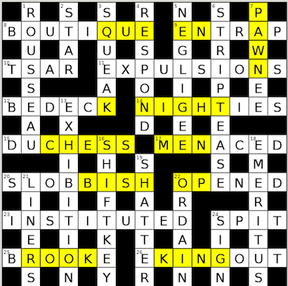 I liked the “meta” surface for RESPOND, and retirement not being an instruction to reverse the letters or a reference to sleep. DUCHESS is a variant of chess and TSAR themed chess sets exist.