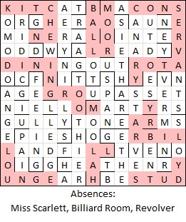 The end of the game is when someone makes a (correct) announcement of person, implement, location. Now, for some reason I had internalised the instruction as “study the grid” and almost at once I spotted STUDY curling round the SE corner, then LOUNGE in the SW corner, with HALL rising between them. There followed KITCHEN, BALLROOM, CONSERVATORY, LIBRARY, & DINING ROOM, and as I checked Wikipedia for the missing location (Billiard Room) I noticed that the rooms in the grid are in the correct relative positions – a marvellous achievement that one can only sit back and admire.