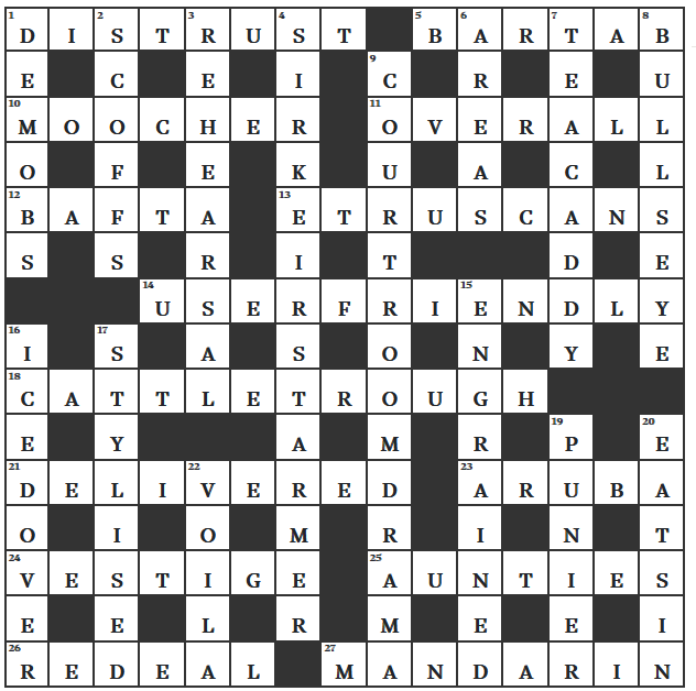 Good puzzle. Struggled but got it all out. I thought that the “one of five daily” part of 27 across was very weak. I had no obection to/no problems with “demobs” (1 down) although it took me a long time to work it out. “Aunties” was LOI.