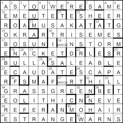 So SAME and AS YOU WERE were built into the grid at an early stage to forestall such complications. If anybody remembers the pair of Groundhog Day puzzles by Plench [of whom I was the ‘CH’ part] we had a mischievous 1ac/1dn combo as DEJA VU and DITTO and I think that may have been lurking somewhere in my head.