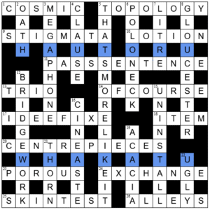 5a We’re used to Nice meaning “in French” but MIT meaning “a North Amrrican expression” seemed to be stretching things, even if used in a clue about a university subject. This was another I had to check as I thought TOPOLOGY had to do with geography, like topography with “topos” being Greek for “place”.