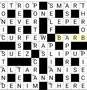 Thanks Shanne. Shame about the typo in the clue for NEVER, and the error in the revealed answer for BARB. I thought the clue for SLIP-UP was okay, ignoring all punctuation.