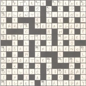 Solving started quickly after getting 1a, 1d and 5a early on to get lots of first letters and fill in a lot of the top half. But I could not solve 19d in the same speedy fashion – no idea why, I’m sure I have seen that exact wordplay before. I thought the clues were reasonably accessible for a Saturday, but still only had about half filled in at the end of the first pass. Discovered I did not know how to spell Piranha, which is silly given my upbringing <link to Monty Python Piranha Brothers>.